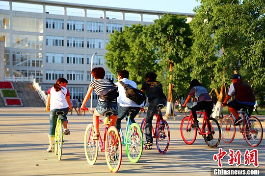 年轻人们骑着绚丽的“死飞”,成为锦江校园一道亮丽的风景线。 张子昊 摄