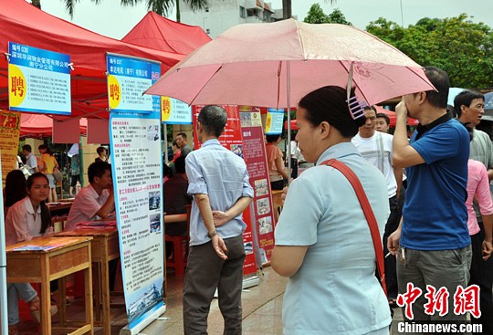 5月24日,2013年广西南宁市民营企业招聘周活动启动,民众雨中求职。当天,100多家企业现场揽才,为高校毕业生、进城务工劳动者、退役军人以及下岗失业人员、残疾人和零就业家庭等就业困难人员提供4000多个就业岗位。中新社发 黄艳梅 摄
