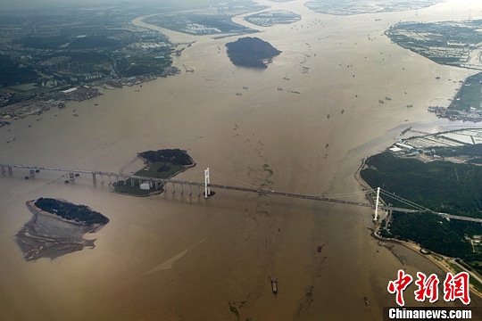 5月24日,被泥沙染黄的珠江流经广东省虎门大桥后注入大海。据该省气象部门介绍,从18日夜间开始,广东遭遇了今年入汛以来持续时间最长的一轮强降雨,直到23日才基本结束,特大暴雨主要集中在梅州、惠州、珠海、揭阳、汕尾、中山、江门等市。中新社发 任晨鸣 摄