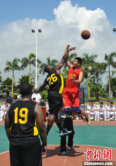 到访湛江的夏洛号巡洋舰官兵5月31日与中国海军南海舰队官兵举行篮球友谊赛。中新社发 高毅 摄