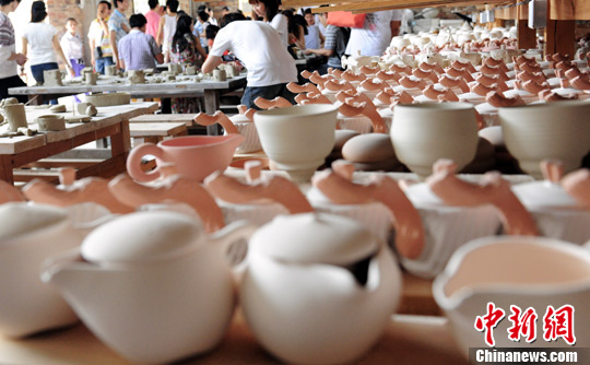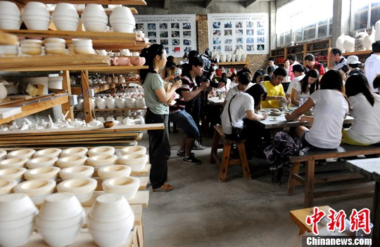 6月1日,华侨大学境外生来到中国瓷都福建德化月记窑陶瓷文化创意产业园体验做陶艺。中新社发 张勤 摄