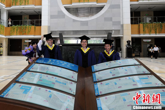 6月3日,暨南大学学生在图书馆拍照留念。中新社发 张勤 摄