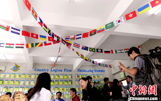 6月4日,国务院第三期“走基层·侨乡行”中央媒体采访团一行,在广州参观暨南大学国际学院并采访国际学院境外生。中新社发 张勤 摄