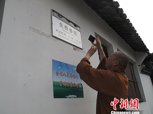 15日,延参法师拍下丰子恺故居前“免费参观”的牌子,希望国内寺庙也可以免费开放。中新社发 徐乐静 摄