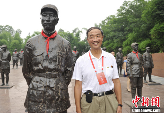 徐向前元帅之子徐小岩6月17日参观成都建川博物馆,在馆内中国抗日壮士群雕广场徐向前元帅雕像前缅怀父亲徐向前元帅。中新社发 安源 摄