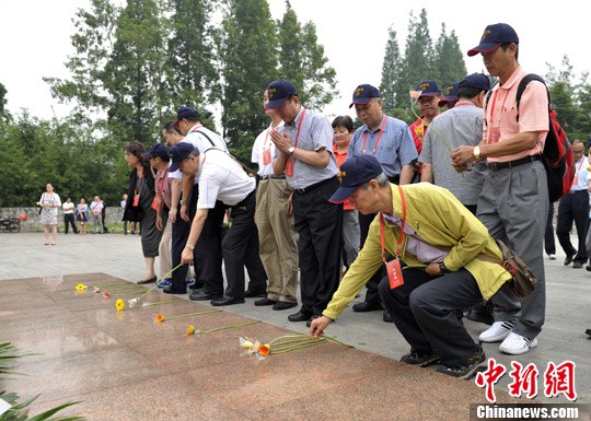 图为两岸嘉宾在抗日壮士群雕广场向英烈敬献鲜花并默哀致意。安源 摄