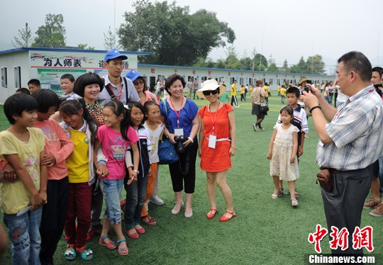 图为华文媒体记者与芦山龙门乡学校的学生们。中新社发 刘忠俊 摄