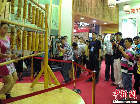 图为成都“非遗节”青神竹筒乐器吸引华文媒体记者。中新社发 刘忠俊 摄