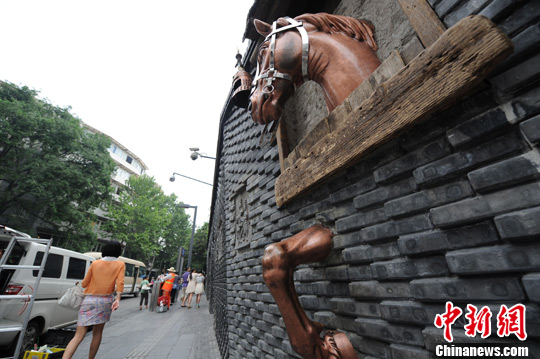 6月中旬,成都市民从街头一面砖墙经过,一匹栩栩如生的马匹雕塑穿墙而过,为墙体增添不少个性。中新社发 张浪 摄