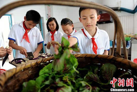6月18日,江西省德兴市海口中心小学的学生正在清洗采摘于自己“菜园”,准备烧制品尝。 卓忠伟 摄