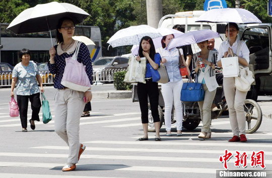 6月18日,北京最高气温32℃ ,市民们纷纷打起了遮阳伞防晒遮阳。中新社发 张家瑞 摄