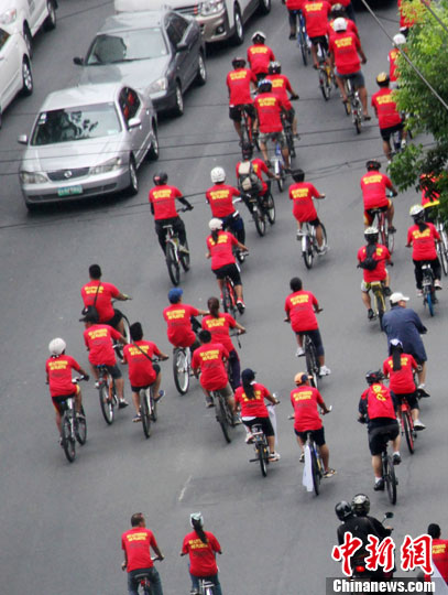 6月18日,数十名菲律宾民众在首都大马尼拉地区马卡蒂市街道上骑自行车宣扬环保理念。图为参与者一路高呼口号,在闹市区穿行。中新社发 张明 摄