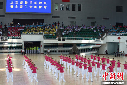 6月27日,山西奥体中心,来自山西省多家省直机关的数千余名党员干部,在此进行全国第九套广播体操比赛。张云 摄