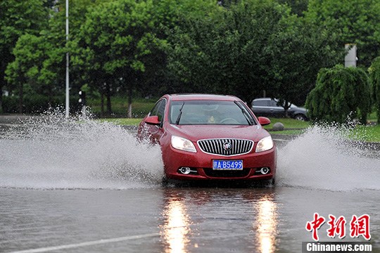 由于雨势猛烈,无法及时全部排出,如注的暴雨致使部分低洼路段积水严重,水深处超过20厘米,来往的汽车溅起数米高的水花。