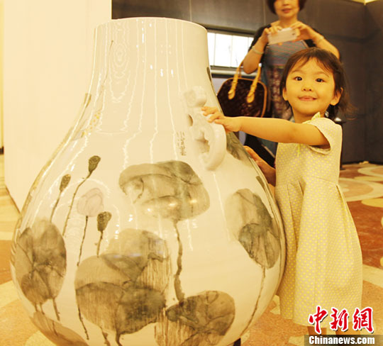 亚洲画廊艺术博览会-上海海派艺术精品展6月下旬在上海展览馆开幕,汇聚了来自中国、韩国、日本、新加坡等国内外30多家亚洲画廊的600多件艺术精品。图为一位小朋友抱着艺术家马小娟的瓷器作品《清夏》。中新社发 袁婧 摄