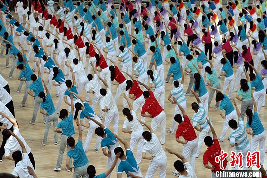 6月28日,由山西省直工委、山西省体育局主办的山西省直机关第九套广播体操比赛及五项全能比赛山西体育中心体育馆举办。山西省64个厅局的近3000名参赛选手生机勃勃在此参赛。中新社发 张云 摄