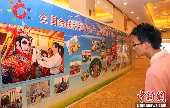 台胞青年千人夏令营是全国台联推动两岸交流的一项品牌项目,已连续举办十届,累计有13000多名台湾青年朋友通过此项活动到大陆参访。图为一位台湾学生在座谈会前观看夏令营十周年展板。