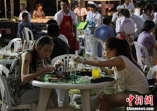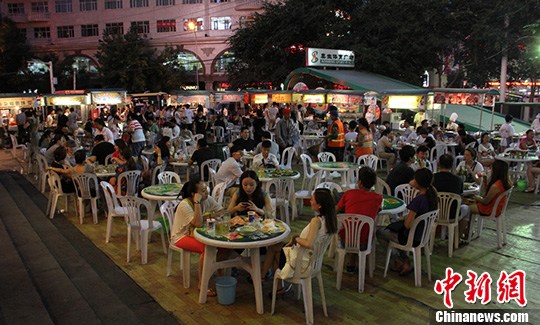 7月4日晚,在位于新疆乌鲁木齐市建设路和平都会前的夜市上,各族群众悠闲的吃着各种烧烤和美食,喝着冰凉、爽口的啤酒和卡瓦斯,享受着夏日夜晚的凉爽和安宁,夜市上人头攒动,热闹非凡。