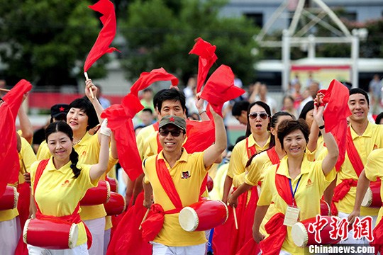 7月4日,清华大学的学子们,来到陕西延安市安塞腰鼓山体育广场,与当地的农民腰鼓队共同献上了一场别开生面的舞鼓表演。中新社发 陆欣 摄