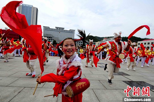 图为9岁的刘子墨成为了清华腰鼓队聘请的年龄最小的腰鼓教员。中新社发 陆欣 摄