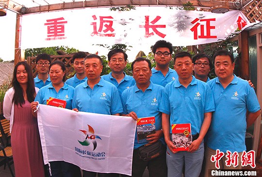 7月5日,“重返长征路”主题活动出征仪式在北京举行,活动总指挥、国际长征运动会发起人杜地(前左三)表示,长征不仅是人类与极限自然挑战的鲜活历史,更应当成为中华民族的集体记忆。中新社发 赵振清 摄