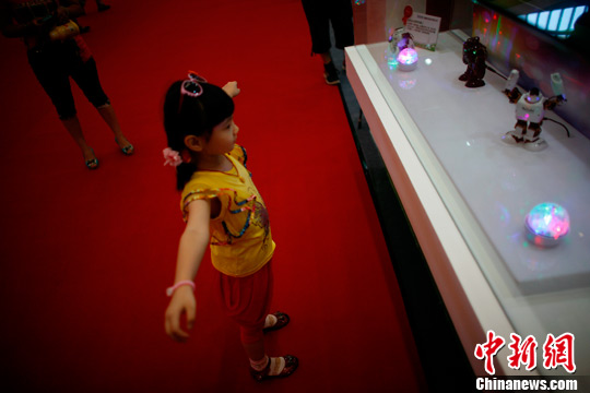 7月5日,一名4岁女孩随着音乐与展台内全球最小的智能机器人BeRobot跳舞。中新社发 佟郁 摄