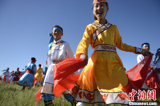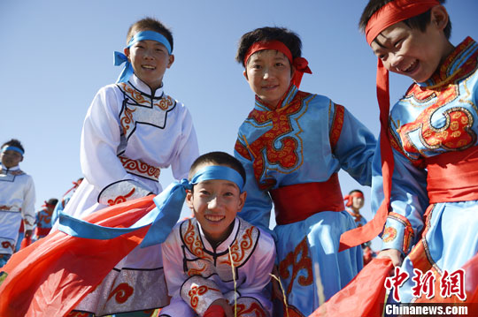 7月5日,内蒙古乌拉盖管理区,随着当地草原的长势越来越好,一年一度的“草原季”来临,在参加当地举行的活动间隙,蒙古族孩子纵情玩耍。中新社发 刘文华 摄