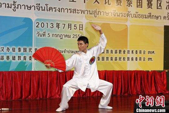 泰国第六届“汉语桥”中学生中文比赛,7月5日在曼谷举行。来自南邦府嘎纳亚尼学校的张学隆在才艺展示环节表演中国功夫,他获得了本次比赛一等奖。中新社发 余显伦 摄