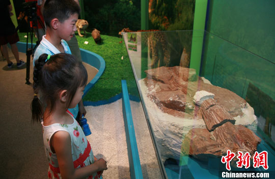 7月5日,市民正在浙江省自然博物馆内观看恐龙化石。中新社发 李晨韵 摄