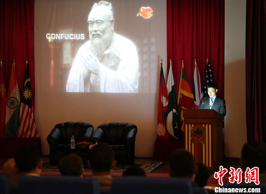当地时间7月11日下午,由尼泊尔军队参谋指挥学院、加德满都大学孔子学院等参与主办的“中国展示”活动在加德满都举行。图为中国军事留学生现场讲解中国教育历史。中新社发 符永康 摄