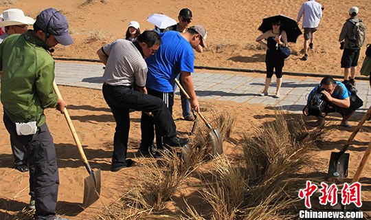 图为沙坡头工作人员与“两岸记者西北行”团员进行治沙实践。中新社发 石龙洪 摄