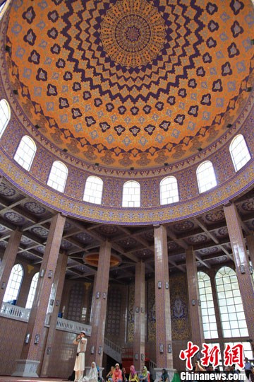 7月30日两岸记者参访宁夏永宁县回族民族文化。图为两岸记者参观永宁县中华回乡文化园金色礼仪大殿。中新社发 石龙洪 摄
