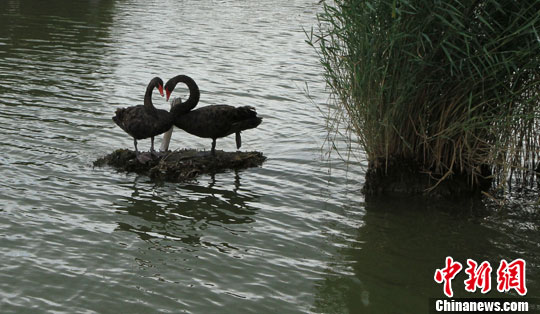 7月31日“两岸记者西北行”走进宁夏石嘴山市沙湖生态旅游区采访。图为沙湖景区内的黑天鹅。中新社发 石龙洪 摄