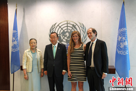 当地时间8月5日,在美国纽约联合国总部,美国新任常驻联合国代表萨曼莎·鲍尔(右二)履新,与联合国秘书长潘基文夫妇合影。李洋 摄