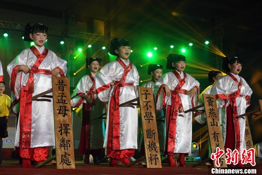 8月5日,“中国寻根之旅”的营员们结束了在北京的集结营活动,图为来自澳门的小营员们表演节目。中新社发 张家瑞 摄
