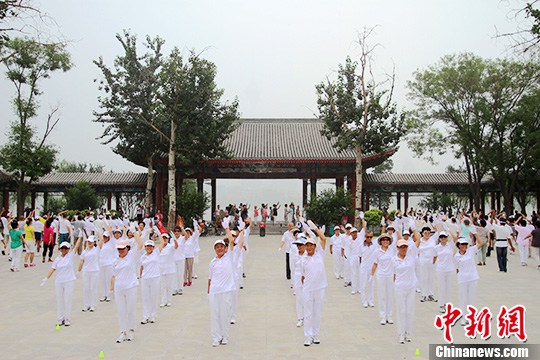 8月6日,百名老人在天津水上公园内跳起快乐舞步健身操,迎接中国第五个全民健身日。中新社发 佟郁 摄