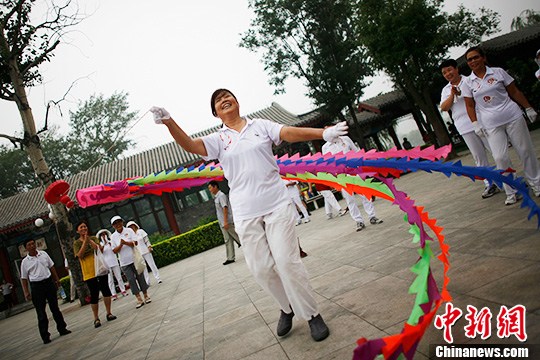 8月6日,一名老妇人在天津水上公园内舞动起“龙凤空竹”,迎接中国第五个全民健身日的到来。中新社发 佟郁 摄