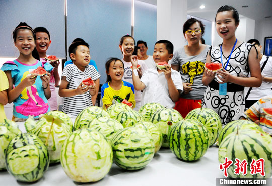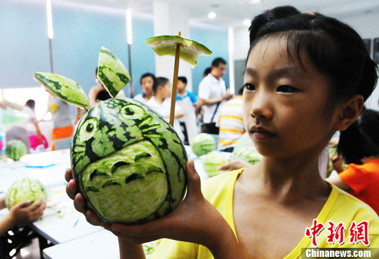 哆啦A梦、龙猫、蝴蝶……8月6日,一群苏州小学生在该市沧浪街道蚕里新村养一社区活动室内进行了一场西瓜雕刻大比拼。孩子们发挥想象力,在巧手的雕琢下,原本十分普通的西瓜变身成为一个个活灵活现的卡通人物。