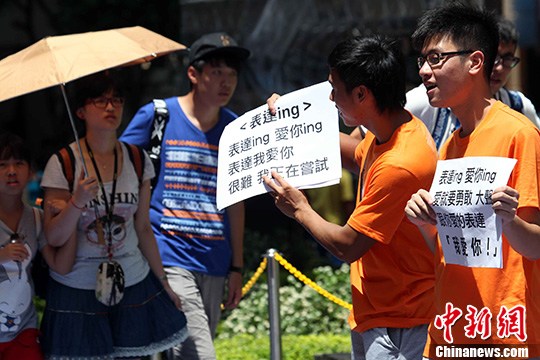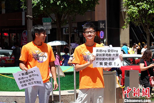 8月6日,香港天文台发出酷热天气警告,一批学生头顶烈日在铜锣湾街头高举爱的宣言,向途人传递关怀身边人,大声说出“我爱你”和“勇敢的表达爱”。中新社发 洪少葵 摄
