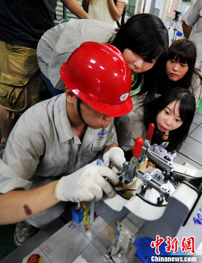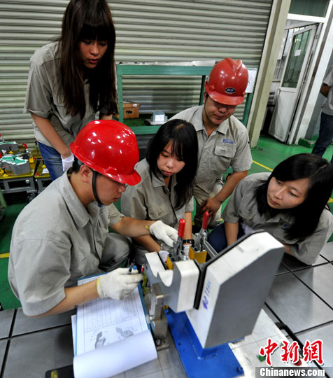 8月6日,三位台湾大学生在位于福州青口的台资企业福享公司研习。中新社发 王东明 摄