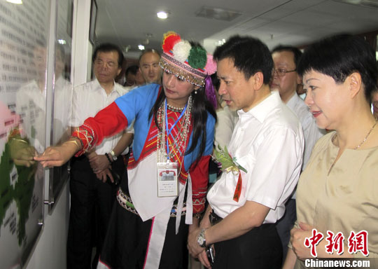 8月6日,台湾著名风景区阿里山所在嘉义县观光协会,在厦门设立办事处,力推嘉义观光旅游、经贸业务在厦门的推广和交流。这是获准在厦门市设立代表机构的第六家台湾经贸社团。图为形象大使阿里山邹族公主雅姆依·臃禧向厦门市有关部门推介阿里山。中新社发 杨伏山 摄