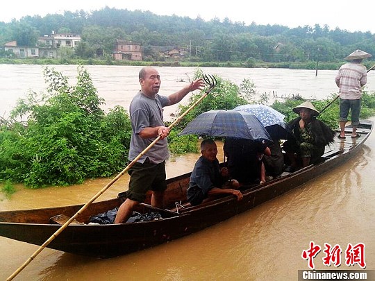 道县蚣坝镇镇村两级干部冒雨紧急转移群众。程任重 摄