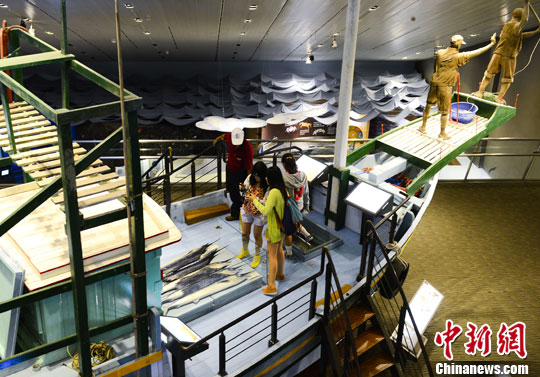 9月3日,游客正在台湾宜兰兰阳博物馆展出的“南风一号”渔船上参观。中新社发 刘震 摄