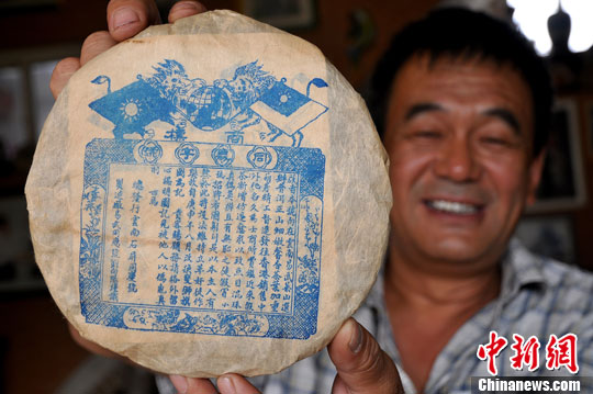 图为治春晨向记者展示民国时期的石屏同庆号普洱茶。马继前 摄