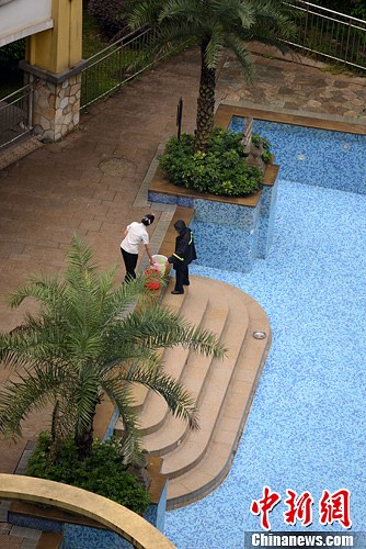 9月4日,成都市区一家游泳池关门歇业,工作人员准备对泳池进行消毒清扫。连日来的降雨天气使成都赶走了“秋老虎”,恢复到了秋日凉爽天气。气象部门预报:此次降雨过程后,四川盆地大部地方最高气温将下降6℃—8℃。