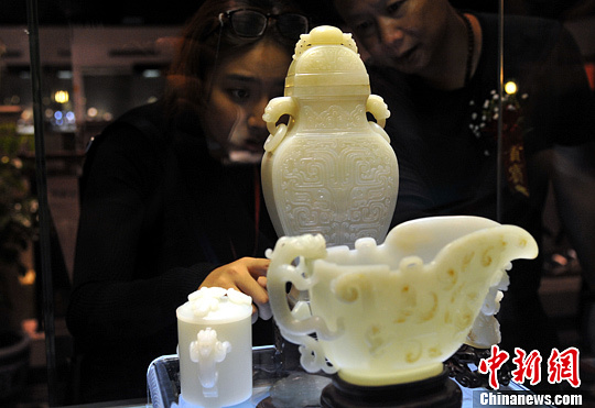 图为展览上,玉雕艺术家向来宾介绍自己的参展作品时,两人目不转睛欣赏一尊精美玉壶。中新社发 孙自法 摄