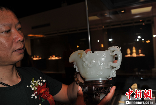 图为一位参展苏帮玉雕艺术家展示、把玩自己的得意之作。中新社发 孙自法 摄