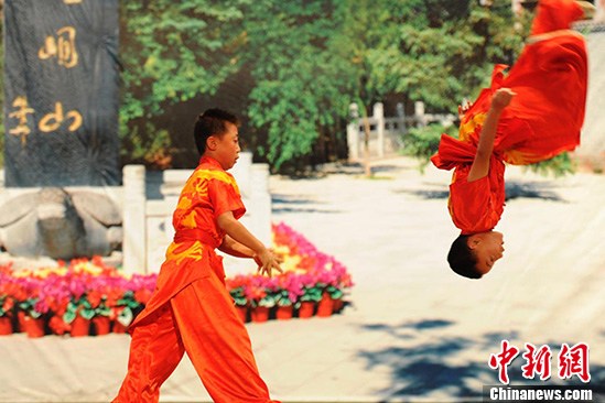 9月4日,甘肃平凉崆峒山下的文武学校内,学生们进行精彩绝伦的崆峒派武术表演,到此间采访的世界华文媒体高层参访团成员频发惊叹。杨艳敏 摄