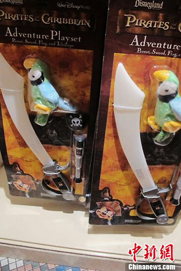 美国迪士尼乐园枪炮战舰轮番上阵,演绎兵家文化。图为迪士尼乐园出售的玩具刀。