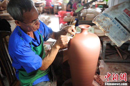 9月5日,手工艺人制作钦州坭兴陶制品。中新社发 陈文 摄